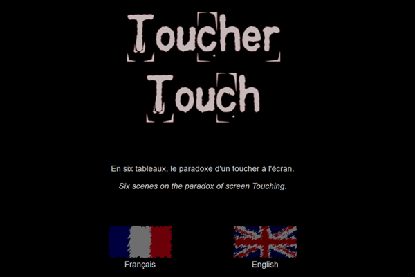 Published originally in 2009 at the author's website, "Toucher"/"To Touch" was featured in the ELO's Electronic Literature Collection 2 published in 2011. About the work the authors write: "It may seem paradoxical to create an online work on touching. One cannot touch directly: in this case touching requires a mediating tool such as a mouse, a microphone or a webcam. This touching experience reveals a lot about the way we touch multimedia content on screen, and maybe also about the way we touch people and objects in everyday life. The internet user has access to five scenes (move, caress, hit, spread, blow), plus a sixth one (brush) dissimulated in the interface. She can thus experience various forms and modalities of touching: the erotic gesture of the caress with the mouse; the brutality of the click, like an aggressive stroke; touching as unveiling, staging the ambiguous relation between touching and being touched; touching as a trace that one can leave, as with a finger dipped in paint; and, touching from a distance with the voice, the eyes, or another part of the body. This supposedly immaterial work thus stages an aesthetics of materiality."--From Electronic Literature Collection 2