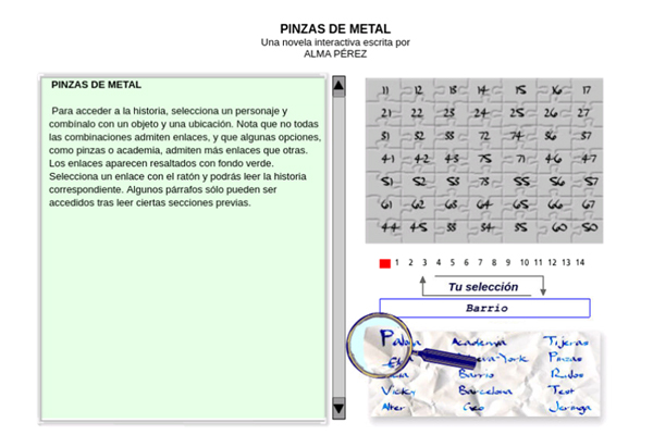 In Spanish: "'Pinzas de metal' es una novela hipertextual interactiva que explora las situaciones de la vida cotidiana de jóvenes, los espacios y objetos que les unen y separan en tiempo y espacio. Su curiosidad por los viajes, romances, el sexo y las drogas les llevará a estados sublimes en los que buscarán la reafirmación de su propio ser y de llenar su vacío existencial con la presencia carnal del “otro”. Pinzas de metal (2003) fue diseñada en flash por Didier Delmas, presenta al lector un menú con personajes, lugares y objetos, organizado en una tabla de tres columnas. El lector debe utilizar una lupa para seleccionar en cada columna primero un personaje, un lugar y un objeto. La historia es nolineal, provocando misterio y perplejidad."--Maya Zalbidea Paniagua, ELMCIP.net