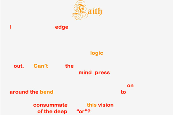 Following its publication in Cauldron & Net in 2002, Rob Kendall's "Faith" was republished in 2006 in the ELO's Electronic Literature Collection 1. The author describes his work as "a kinetic poem that reveals itself in five successive states. Each new state is overlaid onto the previous one, incorporating the old text into the new. Each new state absorbs the previous one while at the same time engaging in an argument with it. The gradual textual unfolding is choreographed to music."--Rob Kendall