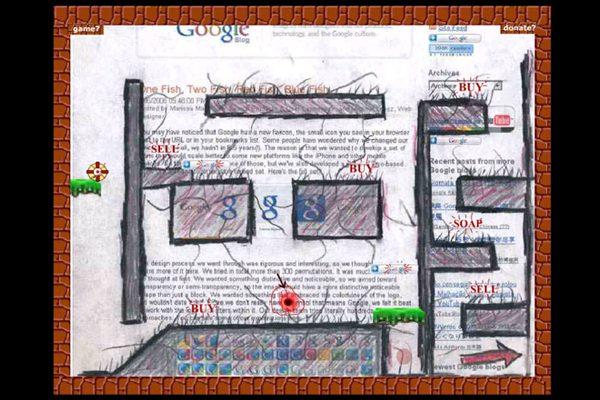 "'i made this. you play this. we are enemies.' is an art game, interactive digital poem which uses game levels built on screen shots from influential community based websites/portals. The game interface drives the poetic texts, the colliding and intersecting images, sounds, words, movements, a forever changing, reader built poetic wonderland. And using messy hand drawn elements, strange texts, sounds and multimedia layering, the artwork lets users play in the worlds hovering over and beneath what we browse, to exist outside/over their controlling constraints. Your arrow keys and space bar will guide you, with the occasional mouse click begging for attention. Each day the internet is humming with a million small interventions. From the humoresque mocking of community content sites like Fark, to the net gate keepers Yahoo and Google, partisan political portals like Huffington Post or the open source/file sharing ‘priates’ of Mininova, the web is an easy tool/weapon for meddling/influencing and sharing/forcing/alluring your opinion on whomever clicks. And yet this digiscape is a deceiving and uneasy place, with continual streams of generic expression/content, cute dogs and accident clips, knocking against an incredible range of political/social beliefs hidden beneath the screen. Even short sequences of words, titled links or blinking ads can reveal the strange, wondrous and treacherous."--From ELMCIP.net