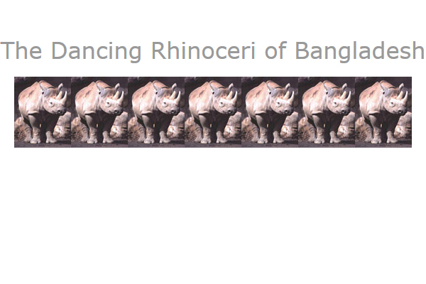 "The Dancing Rhinoceri of Bangladesh" is described as "an interactive poem with a strong message" and "a surrealist poem." Niss states that her goal was "to make a textually-based work that uses techniques other than ordinary hypertext. So instead of clicking to get to a new part of the poem, all the text is presented on the screen at once. The content is revealed by mousing over a word which highlights words scattered across the field which combine to form a sentence."--From Furtherfield