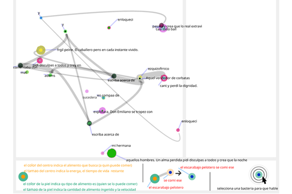 Originally published at the author's website, "Bacterias Argentinas" was republished in ELO's Electronic Literature Collection 3 in 2016. It is described as "a linguistic-multicellular environment that models the interactions between basic organisms in a virtual ecosystem." In Ortiz's words, it is "a dynamic model of autonomous agents that remix genetic information by consuming one another, and in which genetic information is narrative." In this Flash work, Ortiz explores the question of life as information by mapping linguistic elements onto color-coded 'bacteria' that circulate freely in this bio-linguistic ecology. These bacteria carry changeable fragments of sentences as 'genes'—they exchange genetic material upon accumulating or losing energy through phagocytosis (the feeding method of many microorganisms)—and their feeding redistributes energy in the community, since the consumed bacteria cedes its energy (measured here in terms of the length of its genetic code) to the bacteria that consumes it. In this way, the interaction between bacteria, whose feeding strings together narratives within the bacterial community, provides materia prima for metabolic processes that write narratives and also for the decomposition of bacteria whose genetics are not favorable for the narratives, thus constituting a kind of 'natural' selection. This is, however, an “un-natural” selection process, according to Ortiz, since it models a principle of “infinite injustice” that Ortiz equates with neoliberal political and economic policies. It is significant that the bacteria are 'Argentine,' recalling that country’s devastating 2002 financial crisis. The user can confirm their nationality by moving the cursor over each bacteria, hearing the constructed narratives recited by the Argentine 'storyteller' Edgardo Franzetti."--From Electronic Literature Collection 3 Artist's Website In The NEXT ELMCIP Entry