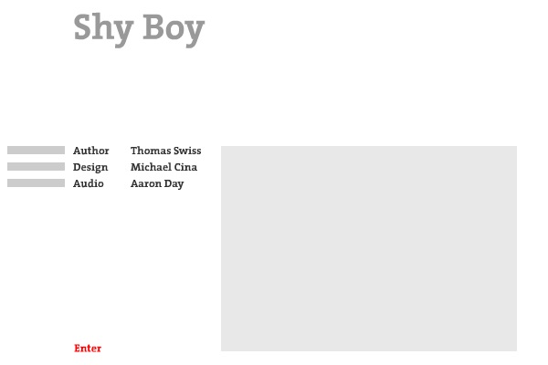 "'Shy Boy' is a Flash poem that uses movement, visual images, and sound to deep into the soul and life of one very shy boy. The monochromatic use of black, gray, and white suggest a child who calls no attention to himself and the vanishing text, his own lack of presence among his schoolyard peers."--From ELMCIP.net