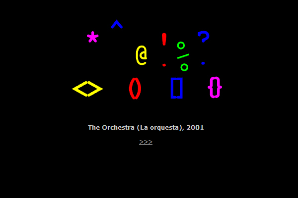 Included in this exhibition are works by Uribe published in BeeHive and The Iowa Review Web, which includes "The Grand Parade" / "El gran desfile," "Smirmish" / "Escaramuza," "Balance" / "Equilibrio," "Balance 2" / "Equilibrio 2" as well as "Orchestra Rehearsal" / "Ensayo de orquesta" and "The Orchestra" / "La orquesto." The editors of the Electronic Literature Collection Volume 3 write: "The late Argentinian poet Ana Mara Uribe (1944-2004) wrote visual poetry from the 1960s with a keen typographical eye that imbued letters with character. Her Typoemas are very much in the Concrete poetry tradition imbuing the typed word on the page with 'verbivocovisual' energy. Her Anipoemas lean more towards a Lettrist tradition, imbuing statuesque letters with personification through motion. Her tools were very basic: sequencing typographic images into animated GIFs to create simple animations that breathed life into letters. Some of her later works used Flash to integrate sound, perspective, and graphical manipulation, animation of the letters she made dance, march, and more. We are offering a mirror of Jim Andrews' publication of Uribe's complete works in Vispo.com."--From Electronic Literature Collection Volume 3
