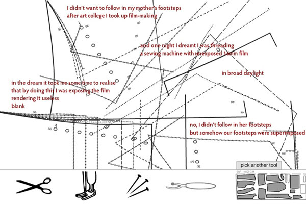 Published at the author's site, "Fitting the Pattern" was later featured in the Electronic Literature Collection 2 in 2011. The author says of her work: "Cutting through memories, pinning down facts, stitching fabrications, unpicking the past - an interactive, animated memoir, created in Flash, exploring aspects of my relationship with my dressmaking mother. Life's mysteries are rarely uncovered by a logical, linear process of deduction. You arrive at answers, ideas, suspicions, intuitions, haphazardly in fragments. Over time you build the picture, piece by piece, shuffling and rearranging, until you start to see a pattern emerging. The structure of 'Fitting the Pattern' attempts to replicate this experience; hence it is a memoir in pieces that the reader can explore, to some extent, in a non-linear fashion. There are certain parallels between my mother's creative craft process and my own in new media; therefore the visual design of the piece is based on the aesthetics of sewing patterns. These similarities, as well as our differences, are embedded in the digital media and text, literally drawn out through animation and dramatized through interactivity. Custom cursors designed as digital dressmaking tools fuse the interactive process into the narrative world, so the reader becomes actively involved in constructing and/or unpicking the narrative."--From Electronic Literature Collection 2