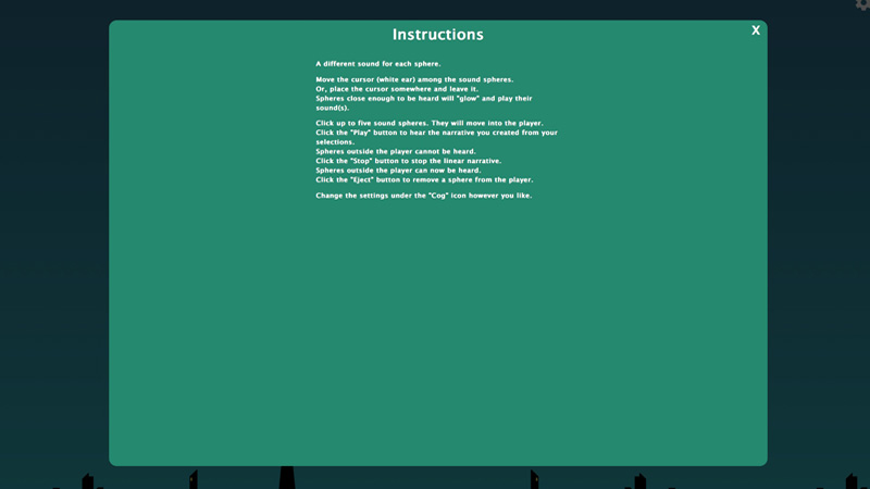 Sound Spheres experiments with the intertwingled potentialities of hypertext, as an information system, and sound(s), as the basis for non-linear storytelling. Through its combination of digital media, interactivity, and sound(s), Sound Spheres explores storytelling as a sense-making mechanic. Participants use sounds carried in multiple, colored spheres moving about the screen space to create and consider narratives that are both linear and serendipitous. The creative research associated with Sound Spheres seeks to explore new modes and methods of storytelling where sound is a fundamental component.—John Barber