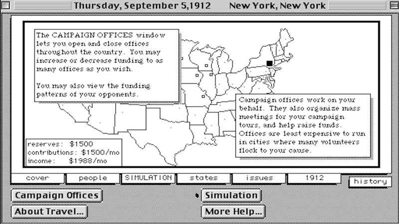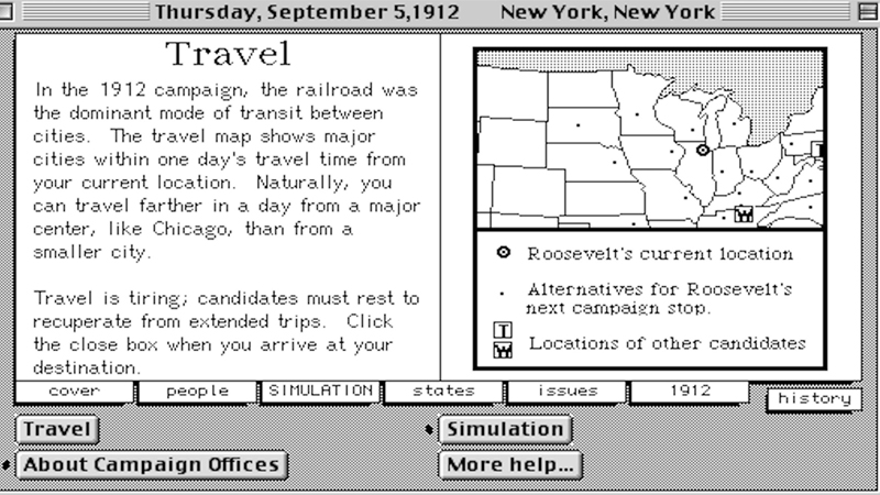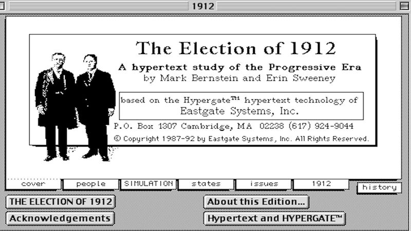 The Election of 1912 is the first hypertext published by Eastgate Systems, Inc. and the first to be produced with the company's own authoring system, Hypergate. Subtitled A Hypertext Study of the Progressive Era, it combines non-linear narrative with robust simulations set within a historical background of one the most fascinating U.S. elections. The varied and robust simulations add to the excitement of discovery and alert readers to the possibilities digital technologies bring to human understanding.