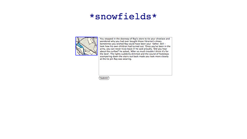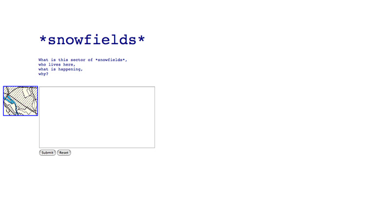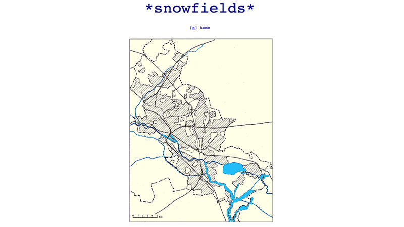 Snowfields is a participatory, interactive narrative based on the genre of a soap opera. The interface takes readers to a city map, which the authors identify as Berlin. Clicking on various places on the map reveals different parts of the snowfields and a textbox where readers can change or add to the story. Each reading results in a different version of events. In the original version, the authors archived the readers' text, which then became part of what the authors call "the reality" of the snowfields. The work was published in the collection of works on mini-CD-ROM that accompanied Christiane Heibach's Literatur im elektronischen Raum. Visitors can see a copy of this book at the "Treasured Artifacts" section in the glass case.