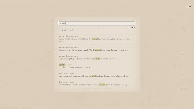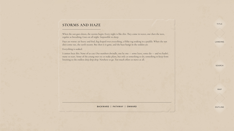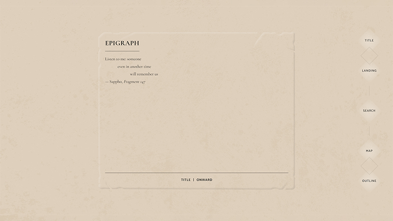 We Descend is an "artifactual novel presented as an archive of writings gathered and transmitted over a vast span of time." Volume 1 was published by Eastgate Systems, Inc. in 1997 on the Storyspace platform. Volume 2, released in 2014, and Volume 3 in 2023, were both produced with Tinderbox for the Web. The story spans four timelines, beginning with a future post-apocalyptic storyline of Egderus who digs down through eons of data to reconstruct cultural history, encountering, along the way, Writings by an ancient who calls himself the Last One. The metaphor of the "archaeological dig" serves "to visualize time" (Bly, Traversals). The 2023 Complete Edition featured in the exhibition is the collection of all three volumes brought together and redesigned for the Web.