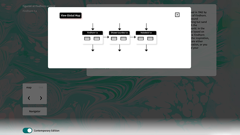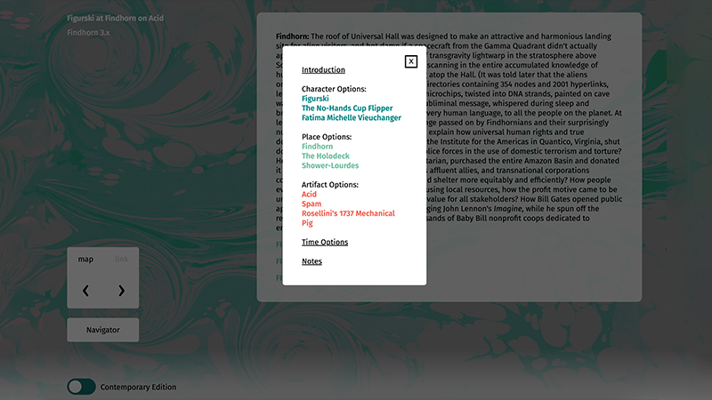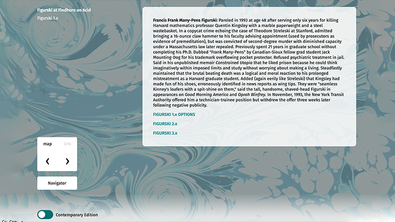Richard Holeton's absurdist hypertext novel, Figurski at Findhorn on Acid, was published by Eastgate Systems, Inc. in 2001 on the Storyspace platform. Along with its satirical treatment of contemporary culture, a hallmark of the novel is its structure: It is a massive work of 147 text spaces built around clearly-defined combinations of three characters, locations, and artifacts, with an additional 147 Notes that contextualize the narrative for readers, and 2001 links connecting spaces and Notes together. The 2021 Web Edition featured in this exhibition offers two reading modes: one for contemporary computers and a second reflecting the look and feel of the MacOS 9.2 Classic environment that readers may have used when first encountering the work in 2001.