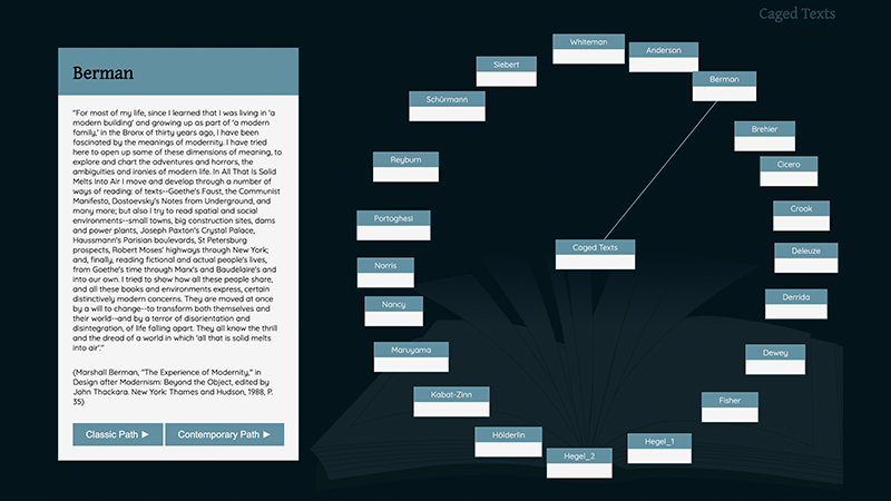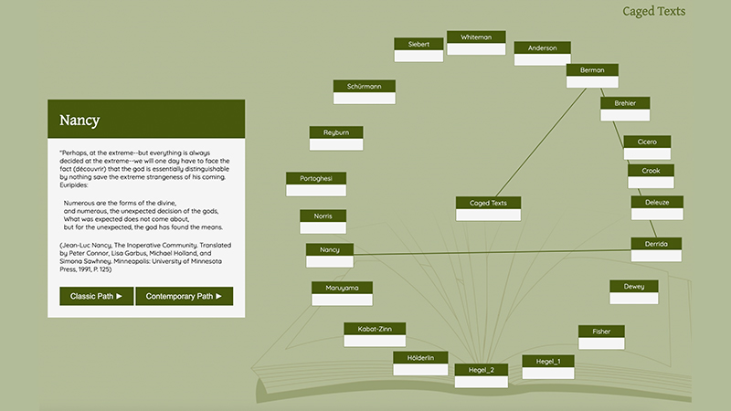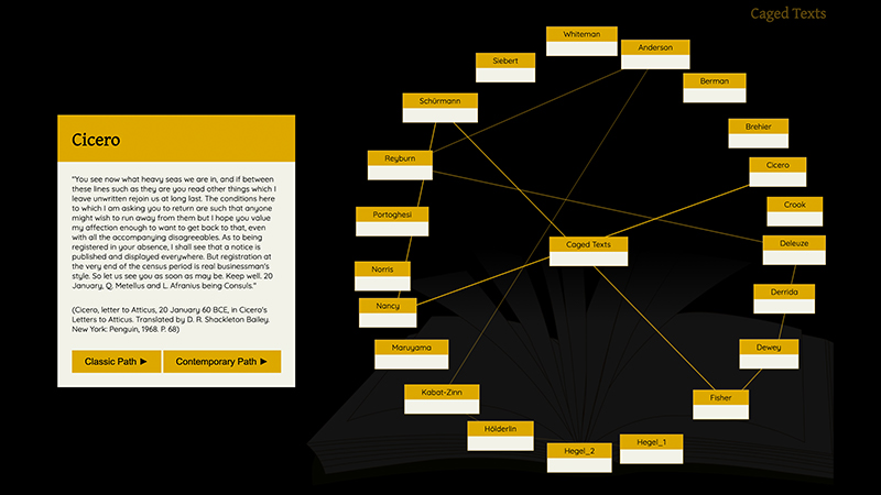 David Kolb's Caged Texts was one of five essays originally conceived for Socrates in the Labyrinth in 1993 as part of his experiment with philosophical hypertextual writing. Developed on the Storyspace platform, it was never completed and, instead, languished among Kolb's archives for 28 years. It is built on a specific structure identifiable by its name—in this case, John Cage, an artist known for musical compositions based on chance. To reflect this aspect of Cage's work, Kolb pulled a book from his shelf, opened it to a random page, and then entered a passage from it into a lexia. This act was repeated until he had entered passages from books by 21 philosophers, from the ancient to contemporary periods.