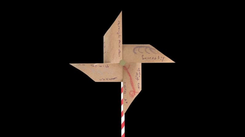 Among the boxes of archives Deena Larsen donated to THE NEXT in 2022 was a hand-made pinwheel that she used during the late 1990s to educate audiences about the new affordances of the electronic medium. Colorful designs and lines of a poem written by Larsen can be seen on each of its blades. The lines on the front of the blades read: "into the wild unknown," "or truths and false words," "through thin ears riding," and "listening closely." The lines on the inside of its cup read: "into my," "soul," "the wind," "whispers." "Once," "upon," "a," "word" appear on the back of each of the four blades spinning on the axle as the pinwheel is blown, turning this child's toy into a poetry machine.