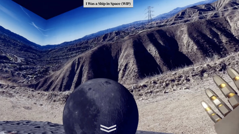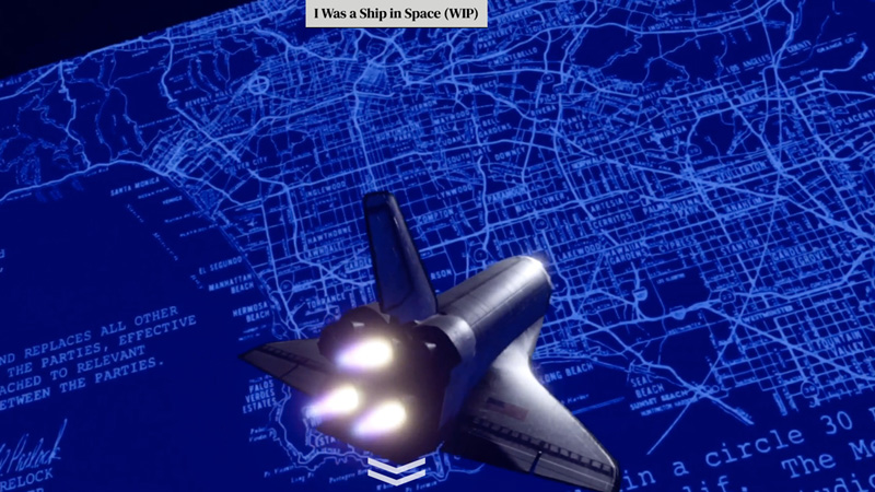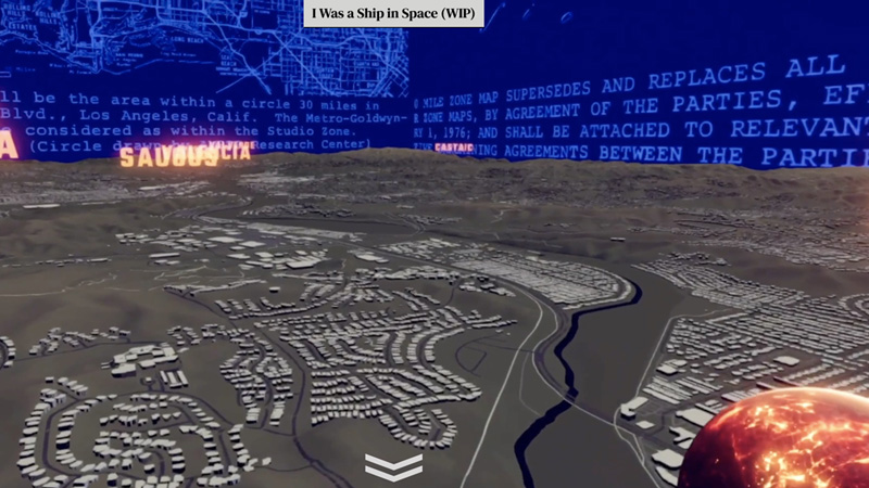I Was a Ship in Space is an immersive narrative created for the Virtual Reality environments. Intended as a "poetic experience," its story explores the "climate crisis, urban planning, and science fiction in a Southern California suburb" (Loyer, I Was a Ship in Space). Hypertext is suggested through touch and gesturing as users interact with objects with hand-held controllers.