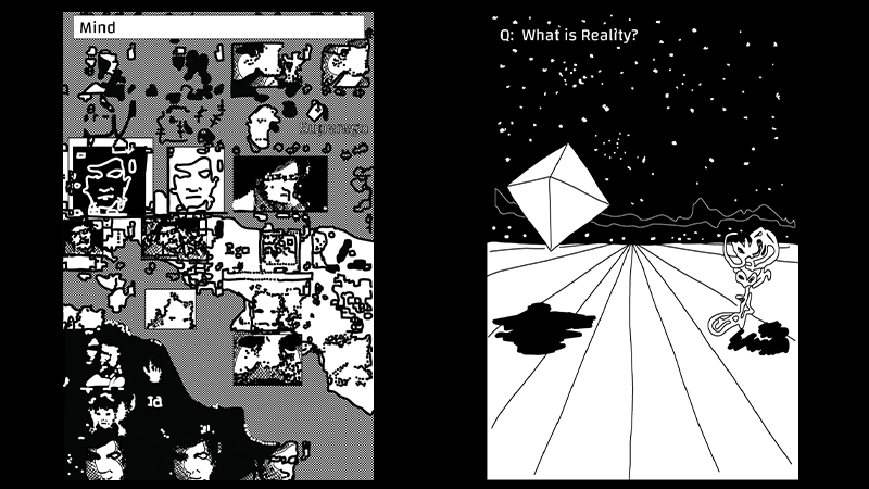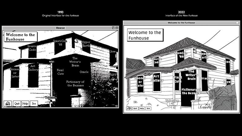 Uncle Buddy's Phantom Funhouse is a hypermedia novel and game built on the HyperCard 2.0 platform and published by Eastgate Systems, Inc. Unlike other hypertext literature the company released, Funhouse was distributed in a box containing five 3.5-inch floppy disks, two musical cassette tapes, page proofs of a short story written by Arthur Newkirk entitled "Tree," and a letter from an editor of Vortex magazine to Buddy Newkirk about the page proofs. At the heart of the story is a mystery: You, the reader, are left to solve the mystery of who Uncle Buddy is and what happened to him. The version featured in this exhibition pulls the boxes' artifacts together into an experience for the Web.