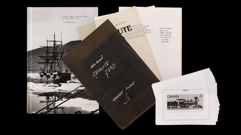 During McLaughlin's Traversal of this work with Grigar hosted by the Digital Scholarship Commons at the University of Victoria Libraries in 2019, McLaughlin gifted THE NEXT with its print three editions. The 1993 Edition that he refers to as a "Hypertext Fiction" is an unbound manuscript with a hand-lettered cover by the author, produced while in Ireland and dated spring 1993; the 1994 Edition, which consists of all of the lexias from the digital version printed on paper as note cards of "Hypertext," dated 1993-Early 1994; and the 2019 Edition, a self-published bound book, titled Notes Toward Absolute Zero: A Long Prose Poem, dated January 2019. All three are on display so as to complement the digital version featured in the exhibition.
