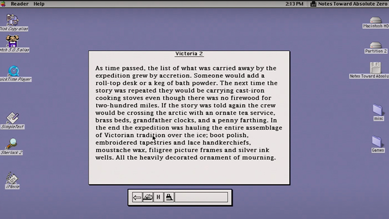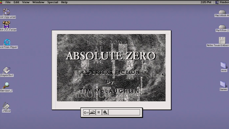 Shipwrecks, train wrecks, and wrecked hearts permeate Tim McLaughlin's Notes Toward Absolute Zero, a hypertext narrative produced with Storyspace in 1993 and published by Eastgate Systems, Inc. in 1995 on 3.5-inch floppy disk and in 1996 on CD-ROM. As the title suggests, it is a story about cold so absolute that order and predictability are lost. As Rob Kendall points out in his study of the work, "Parsing the Cold: McLaughlin's Notes Toward Absolute Zero," the overarching theme of the narrative is the power of cold to both destroy and preserve.