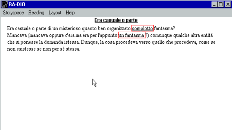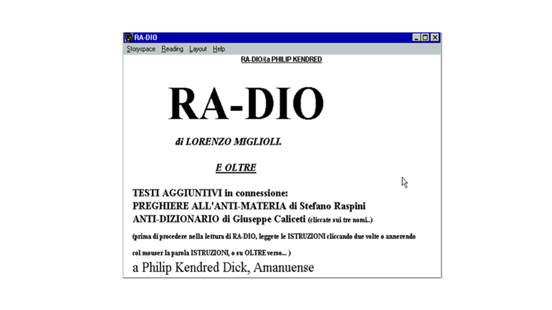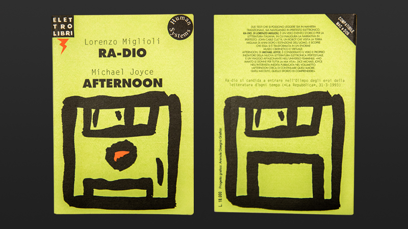 RA-DIO is a seminal hypertext created by Italian artist Lorenzo Miglioli. Designed for the Macintosh computer and the Storyspace platform and, later, extended to PCs running the MS-DOS operating system, it was distributed on two 3.5-inch floppy disks, along with the book of the same name, in a plastic sleeve. The book and electronic media constituted a joint venture between Castelvecchi Editore and Human Systems as part of its experimental series, "Elettrolibri." The former was an established publisher that had the rights for RA-DIO. While Miglioli's hypertext is published on the two disks, it also appears in the the book as a print out. The project was wildly popular with the available copies selling out before more could be printed. The version used for this exhibition came on a floppy disk designated for the Macintosh computer but was only accessible on a PC. The second disk is formatted for MS-DOS.