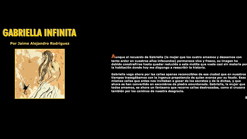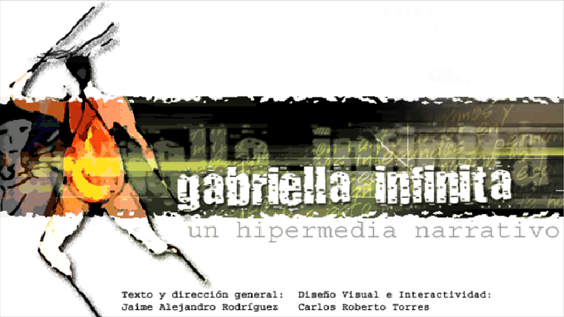 Gabriella Infinita is a multimedia Flash narrative told in three parts about Gabriella, a pregnant Colombian woman, searching for the father of her unborn child during the chaotic siege in Bogotá. The way in which readers lose themselves in the story's gripping plot reflects the way they lose themselves in the hypertextual experience.