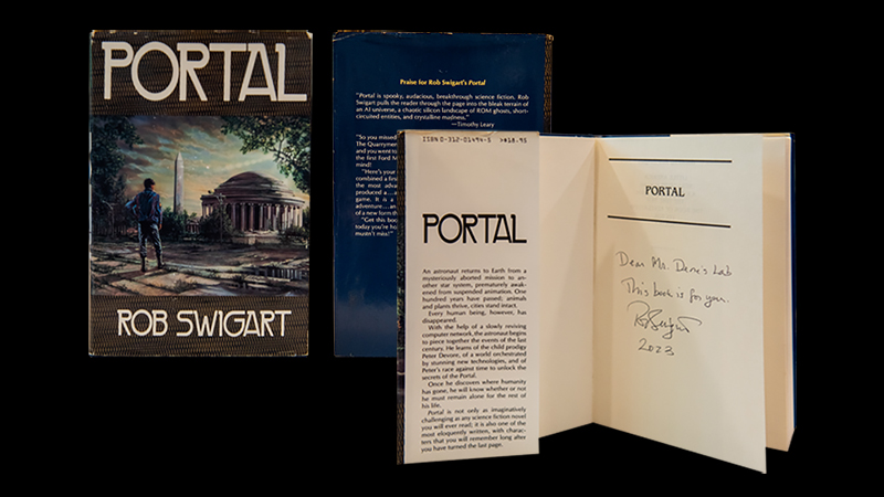 Two years after the release of his text adventure game Portal (Activision, 1986), Swigart, an established novelist, penned this print novel for St. Martin's Press. Over its 340+ pages, it extends the game's plot and provides back stories of the many characters the story features. Swigart presented this signed copy to Grigar during the semester her students developed the first two levels of the Virtual Reality adaptation of the game and novel, a project called "DATA ENTRY: PORTAL" also featured in this exhibition.