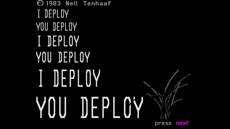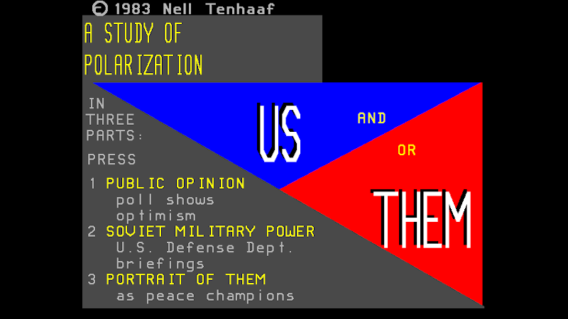For my first database work, I wanted to make an artwork that would circulate outside the gallery system, and to use a database tree structure to make a portrait of false choice – or more accurately, propose that choice might exceed an obvious binary. This database was presented several times from mainframe computers via public access terminals.